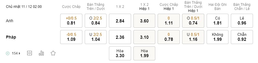 Soi kèo châu Á Anh vs Pháp: 0.81*0/0.5*1.09
