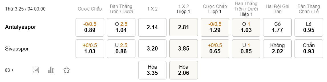 Soi kèo hiệp 1 Antalyaspor vs Sivasspor: 1.29*0/0.5*0.65