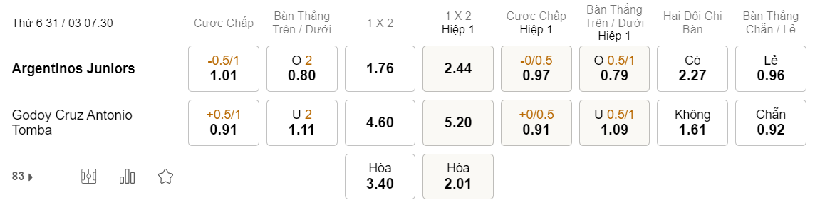 Tỉ lệ kèo Argentinos Juniors vs Godoy Cruz