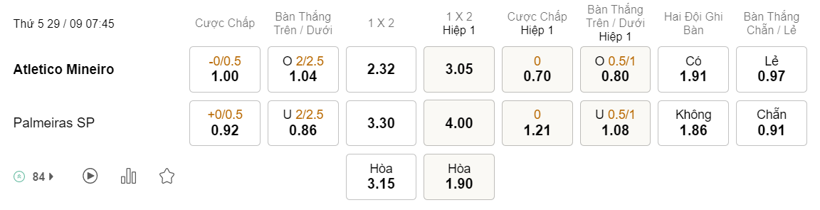 Tỉ lệ kèo Atletico Mineiro vs Palmeiras