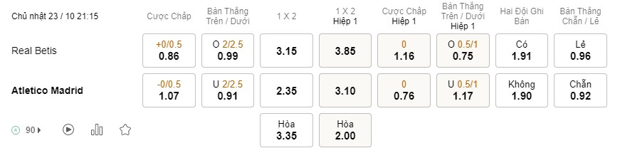 Soi kèo hiệp 1 Betis vs Atletico Madrid: 1.16*0*0.76