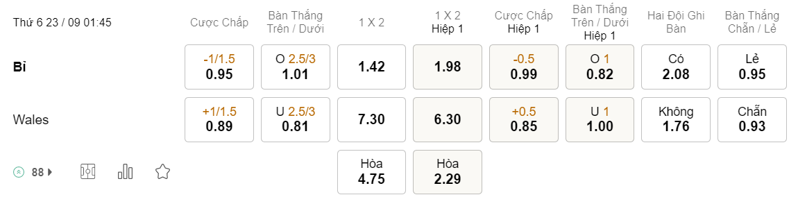 Tỉ lệ kèo Bỉ vs Wales