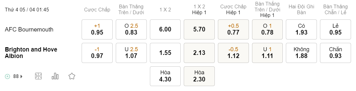Soi kèo hiệp 1 Bournemouth vs Brighton: 0.77*0.5*1.12