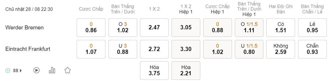 Soi kèo hiệp 1 Bremen vs Frankfurt: 0.88*0*1.02