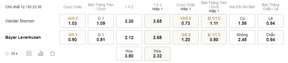 Soi kèo hiệp 1 Bremen vs Leverkusen: 0.73*0/0.5*1.20
