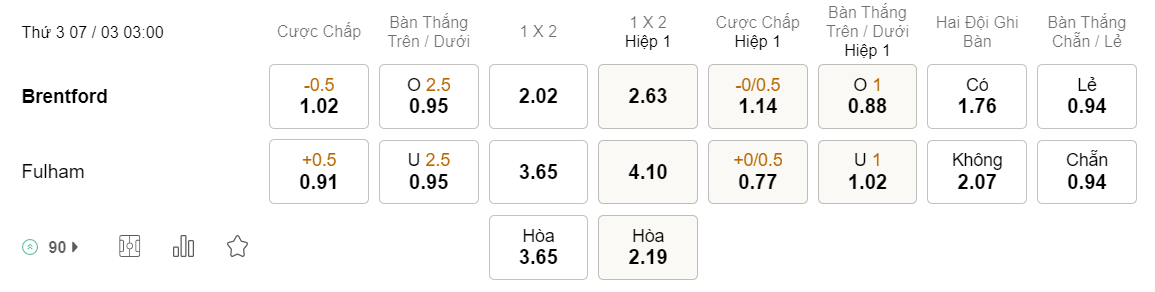 Tỉ lệ kèo Brentford vs Fulham