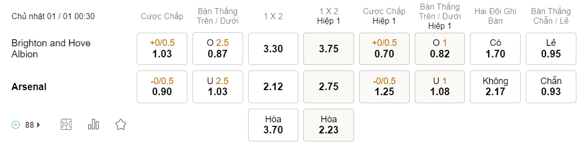 Soi kèo hiệp 1 Brighton vs Arsenal: 0.70*0/0.5*1.25