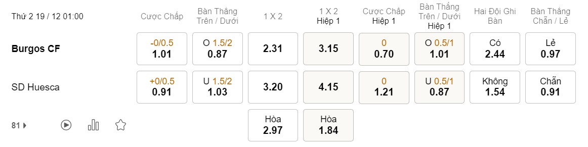 Tỉ lệ kèo Burgos vs Huesca
