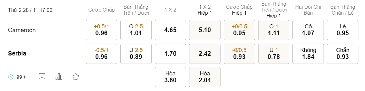 Soi kèo châu Á Cameroon vs Serbia: 0.96*0.5/1*0.96