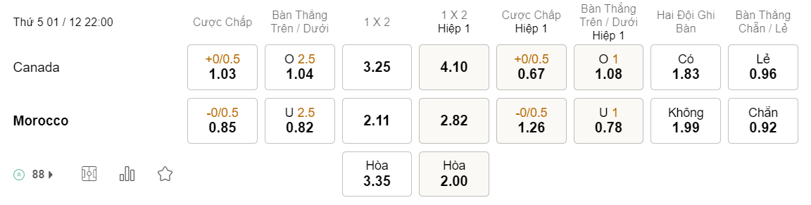 Soi kèo tài xỉu Canada vs Morocco: 1.04*2.5*0.82