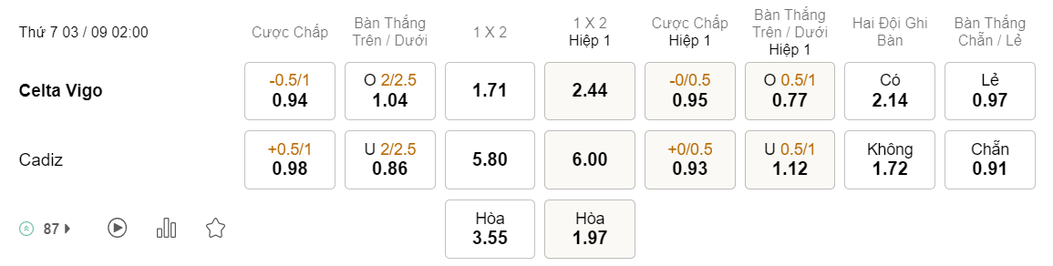 Soi kèo châu Á Celta Vigo vs Cadiz: 0.94*0.5/1*0.98