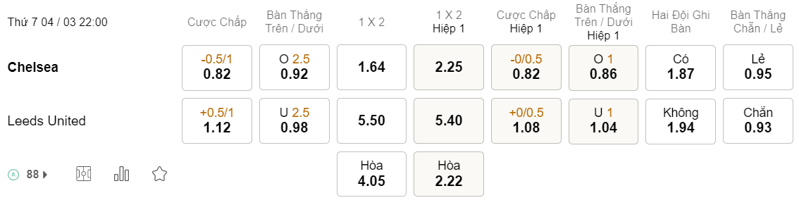 Soi kèo hiệp 1 Chelsea vs Leeds: 0.82*0/0.5*1.08