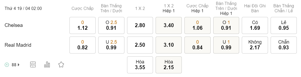 Tỉ lệ kèo Chelsea vs Real Madrid