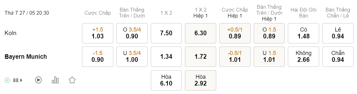Soi kèo hiệp 1 Cologne vs Bayern: 0.89*0.5/1*1.01
