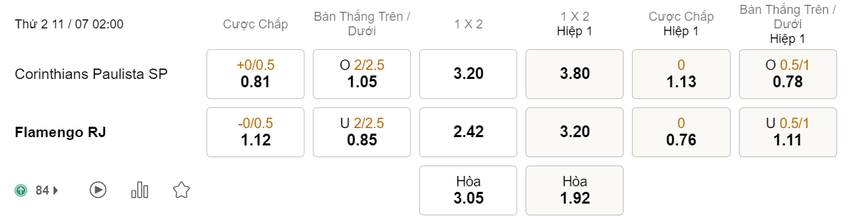 Soi kèo hiệp 1 Corinthians vs Flamengo: 1.13*0*0.76