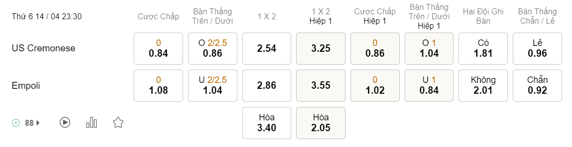 Soi kèo châu Á Cremonese vs Empoli: 0.84*0*1.08