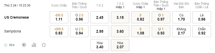 Soi kèo hiệp 1 Cremonese vs Sampdoria: 0.82*0*1.08