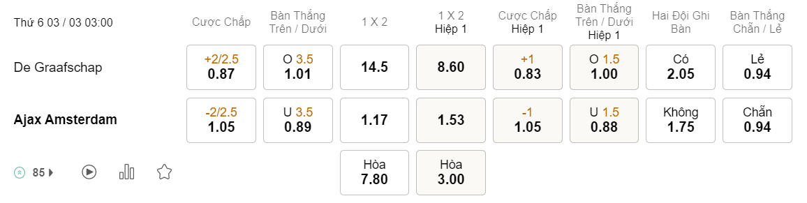Soi kèo hiệp 1 De Graafschap vs Ajax: 0.83*1*1.05