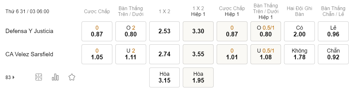 Tỉ lệ kèo Defensa Justicia vs Velez