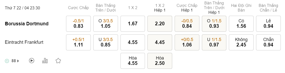 Tỉ lệ kèo Dortmund vs Frankfurt