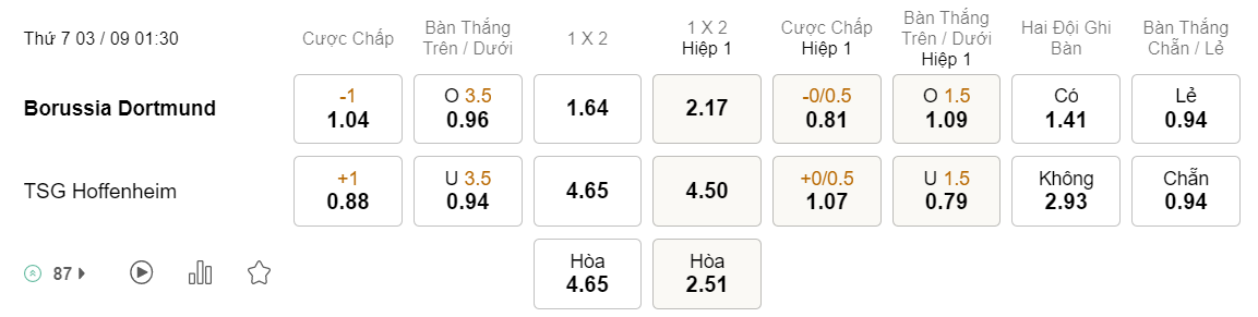 Tỉ lệ kèo Dortmund vs Hoffenheim