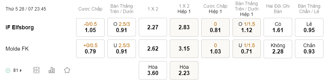Soi kèo hiệp 1 Elfsborg vs Molde: 0.81*0*1.03