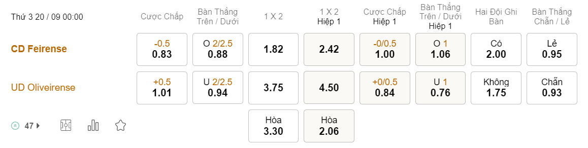 Soi kèo tài xỉu Feirense vs Oliveirense: 0.88*2/2.5*0.94