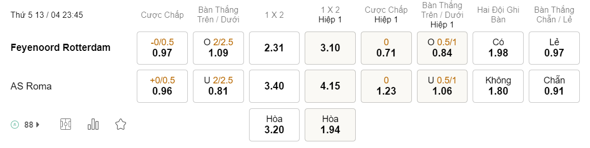 Tỉ lệ kèo Feyenoord vs Roma