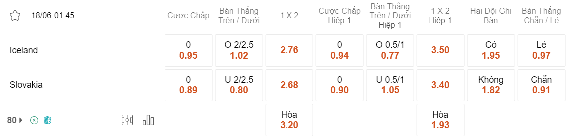 Soi kèo hiệp 1 Iceland vs Slovakia: 0.94*0*0.90