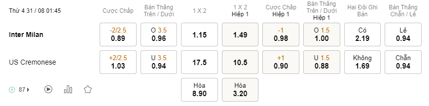 Soi kèo châu Á Inter vs Cremonese: 0.89*2/2.5*1.03