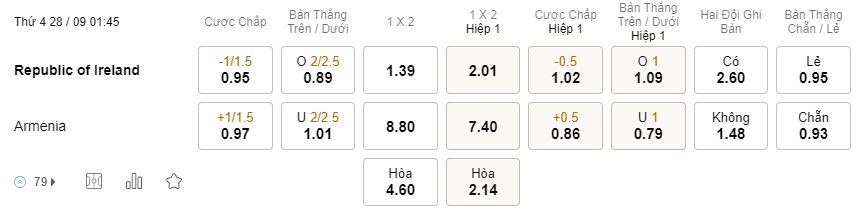 Soi kèo châu Á Ireland vs Armenia: 0.95*1/1.5*0.97