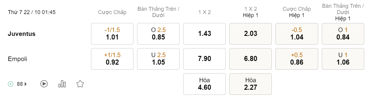 Soi kèo hiệp 1 Juventus vs Empoli: 1.04*0.5*0.86