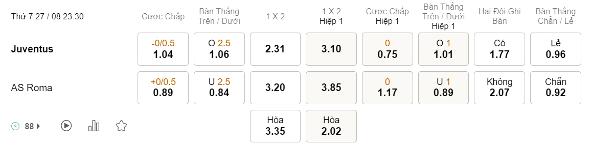 Soi kèo châu Á Juventus vs Roma: 1.04*0/0.5*0.89