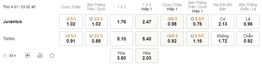 Tỉ lệ kèo Juventus vs Torino