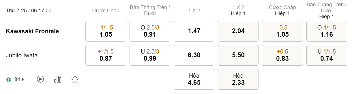 Soi kèo hiệp 1 Kawasaki Frontale vs Jubilo Iwata: 1.05*0.5*0.83