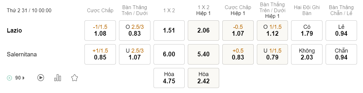 Soi kèo châu Á Lazio vs Salernitana: 1.08*1/1.5*0.85