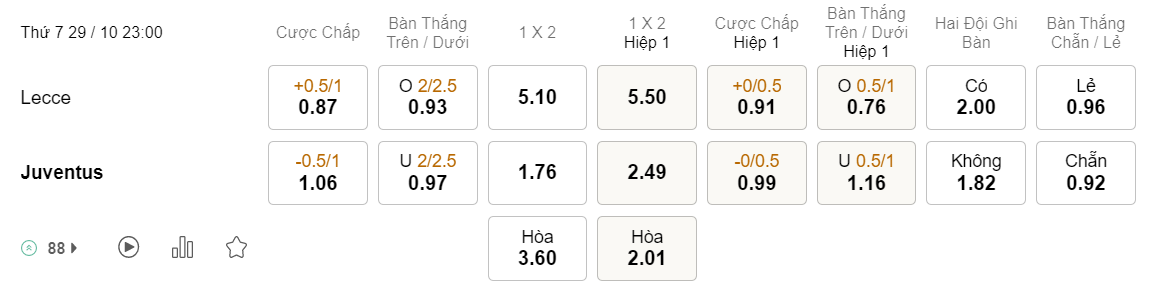 Soi kèo hiệp 1 Lecce vs Juventus: 0.91*0/0.5*0.99