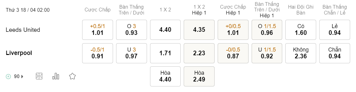 Soi kèo hiệp 1 Leeds vs Liverpool: 1.01*0/0.5*0.87