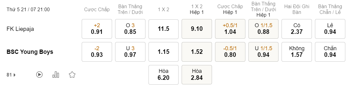 Tỉ lệ kèo Liepaja vs Young Boys