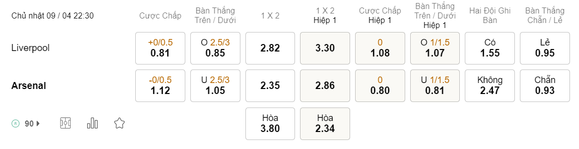 Tỉ lệ kèo Liverpool vs Arsenal