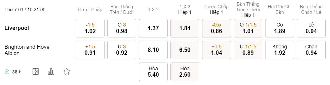 Soi kèo châu Á Liverpool vs Brighton: 1.02*1.5*0.91