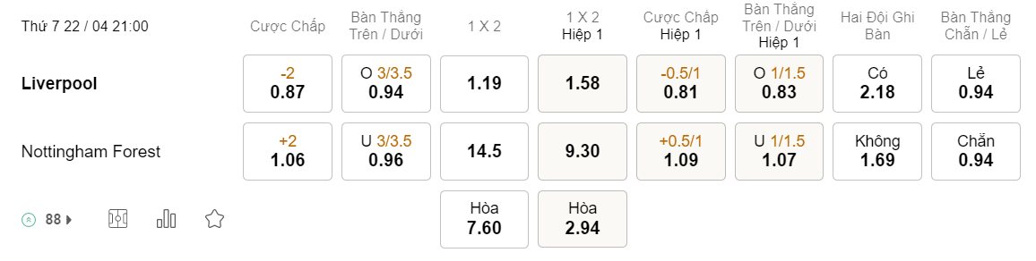 Soi kèo châu Á Liverpool vs Nottingham: 0.87*2*1.06