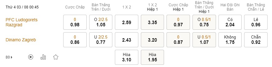 Tỉ lệ kèo Ludogorets vs Dinamo Zagreb