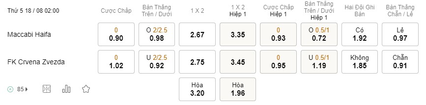Tỉ lệ kèo Maccabi Haifa vs Crvena Zvezda