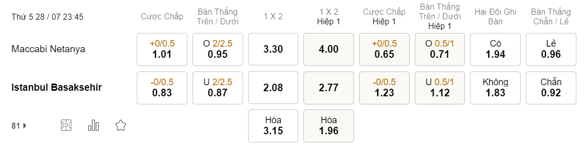Tỉ lệ kèo Maccabi Netanya vs Basaksehir