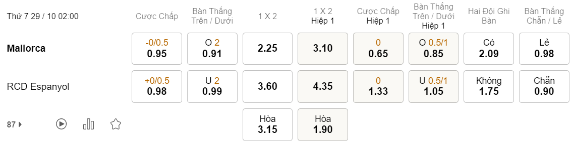 Soi kèo hiệp 1 Mallorca vs Espanyol: 0.65*0*1.33