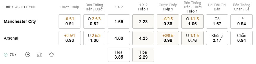 Tỉ lệ kèo Man City vs Arsenal