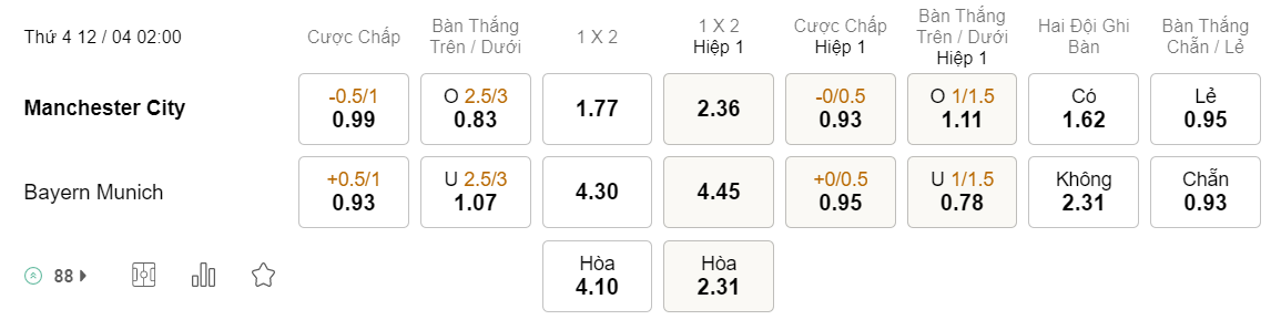 Soi kèo châu Á Man City vs Bayern: 0.99*0.5/1*0.93