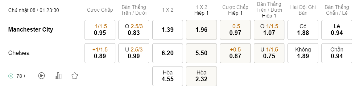 Tỉ lệ kèo Man City vs Chelsea