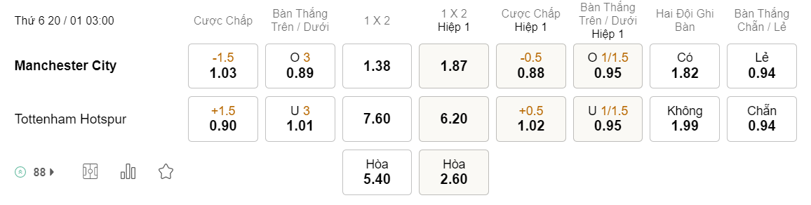 Soi kèo hiệp 1 Man City vs Tottenham: 0.88*0.5*1.02